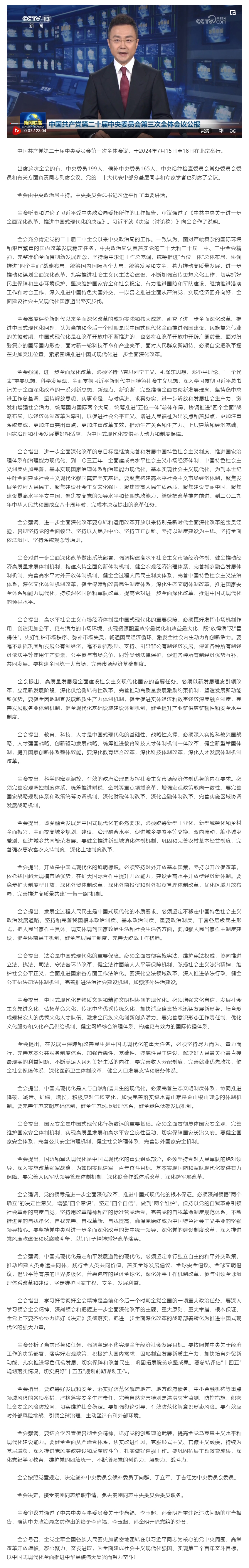 中国共产党第二十届中央委员会第三次全体会议公报