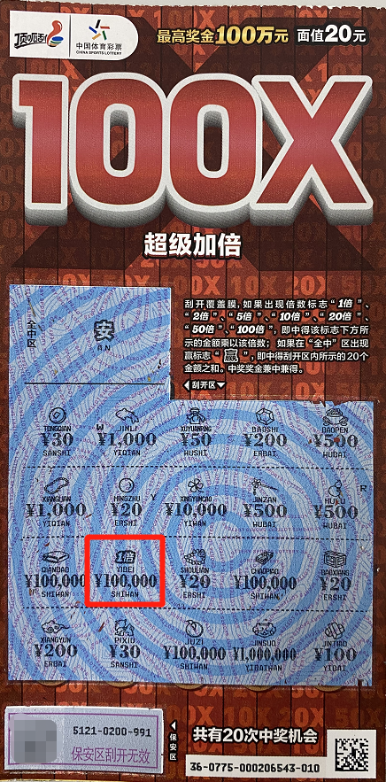 “我当时看到刮出来一个‘1倍’就知道肯定是中奖了,但是越往后刮,‘0’越多,感觉有点激动,开始查有多少个‘0’,才发现是10万大奖。我爱人在旁边看到刮出来大奖,反倒很淡定。我一直感觉特别不可思议,好像中了10万一点都不现实一样!”