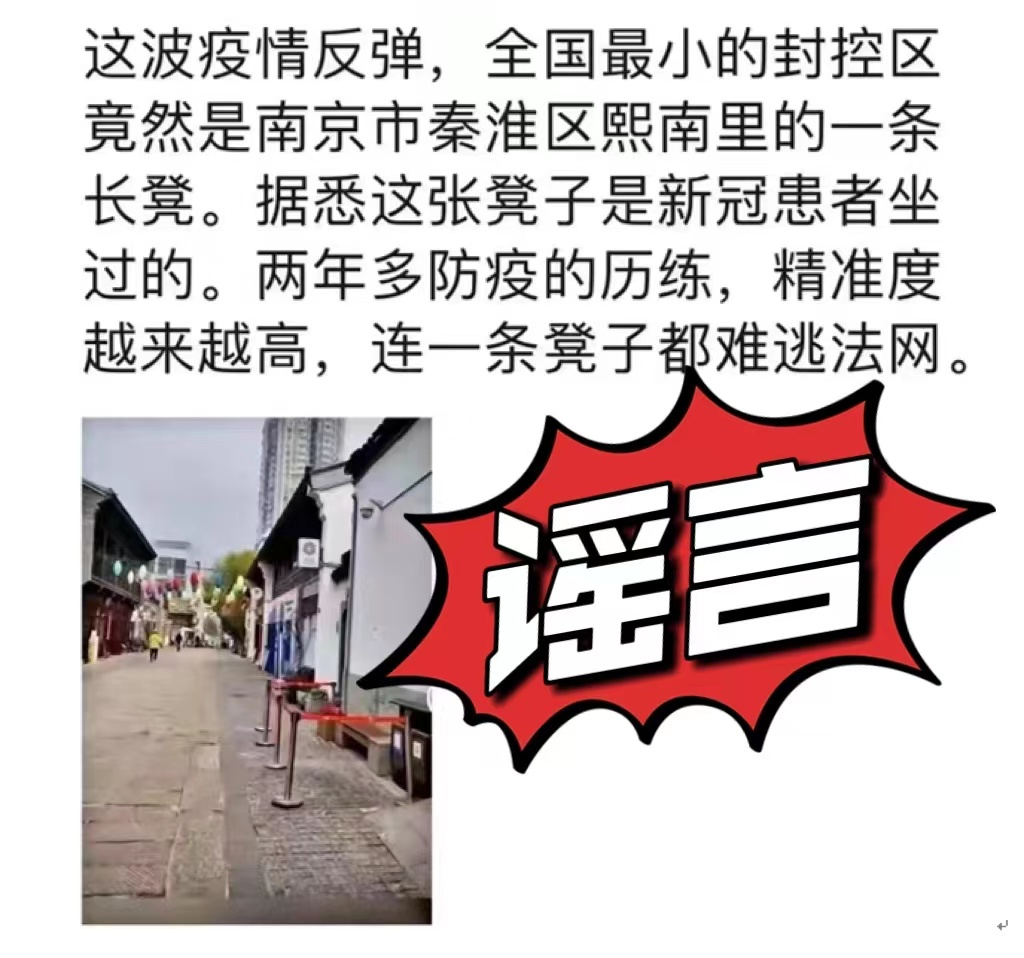 近日,一则“全国最小封控区竟是南京熙南里的一条长凳”的消息在网上流传。经调查发现,此则消息与现实有所出入。